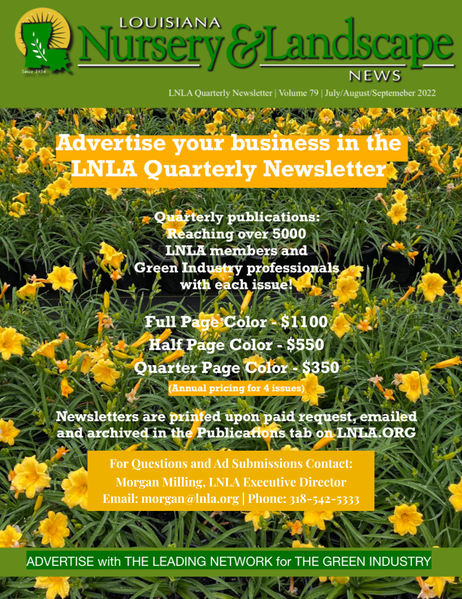 SUMMER 2025 - Cover featuring LNLA's visit to the Capitol SPRING 2025 & MEMBERSHIP DIRECTORY - Cover featuring past James A. Foret award winners. WINTER 2024 - Cover featuring Gerald Foret Wholesale Nursery. Inside: LNLA 70th Celebration. FALL 2024 - Cover featuring AMK Landscape. Inside: Gala XIV and a special shout out to Rick Webb. SUMMER 2024 - Cover featuring Aztec Labor SPRING 2024 & MEMBERSHIP DIRECTORY - LNLA Celebrates 70 Years! Cover sponsored by Monk Farms WINTER 2023 - Cover featuring Nousbo / Hi-Cote FALL 2023 - Cover featuring Windmill Nursery in Folsom, LA SUMMER 2023 - Cover featuring Landscape Management Services of Lake Charles Spring 2023 & MEMBERSHIP DIRECTORY - Cover sponsored by Poole Brother's Nursery, Celebrating 100 years! WINTER 2022 - Cover featuring Clegg's Nursery - HAPPY NEW YEAR FALL 2022 - Cover featuring Buddy Lee, sponsored by Monk Farms SUMMER 2022 - Cover sponsored by Forest Hill Plant Ceaux. SPRING 2022 & MEMBERSHIP DIRECTORY - Cover sponsored by Gerritt Monk & Monk Farms. Directory Cover 2022 Louisiana Nursery Festival poster; artist Margie Tate. WINTER 2021 - Cover sponsored by Bracy's Nursery FALL 2021 - Cover Sponsored by Debbie Head & Poole Brother's Nursery, Lecompte, LA SUMMER 2021 - Cover submitted by Ashley Edwards, LSU AgCenter Hammond Research Station. SPRING 2021 & MEMBERSHIP DIRECTORY - Cover photo submitted by Windmill Nursery & Directory cover photo submitted by Ashley Edwards, LSU AgCenter Hammond Research Station. WINTER 2020 - Cover sponsored by Clegg's Nursery FALL 2020 - Cover sponsored by Monk Farms SUMMER 2020 - Featuring Perino's Home and Garden Center SPRING 2020 - Featuring Saxon Becnel & Sons 2020 LNLA Membership Directory - Featuring Langridge Plant Sales WINTER 2019 - Featuring Monk Farms FALL IS FOR PLANTING 2019 - Featuring Louisiana Growers SUMMER 2019 - Featuring Hoogland's Landscape SPRING 2019 - Featuring Bracy's Nursery 2019 LNLA Membership Directory - Featuring Ducote's Tree Farm Contact [email protected] for more information about advertising with LNLA.